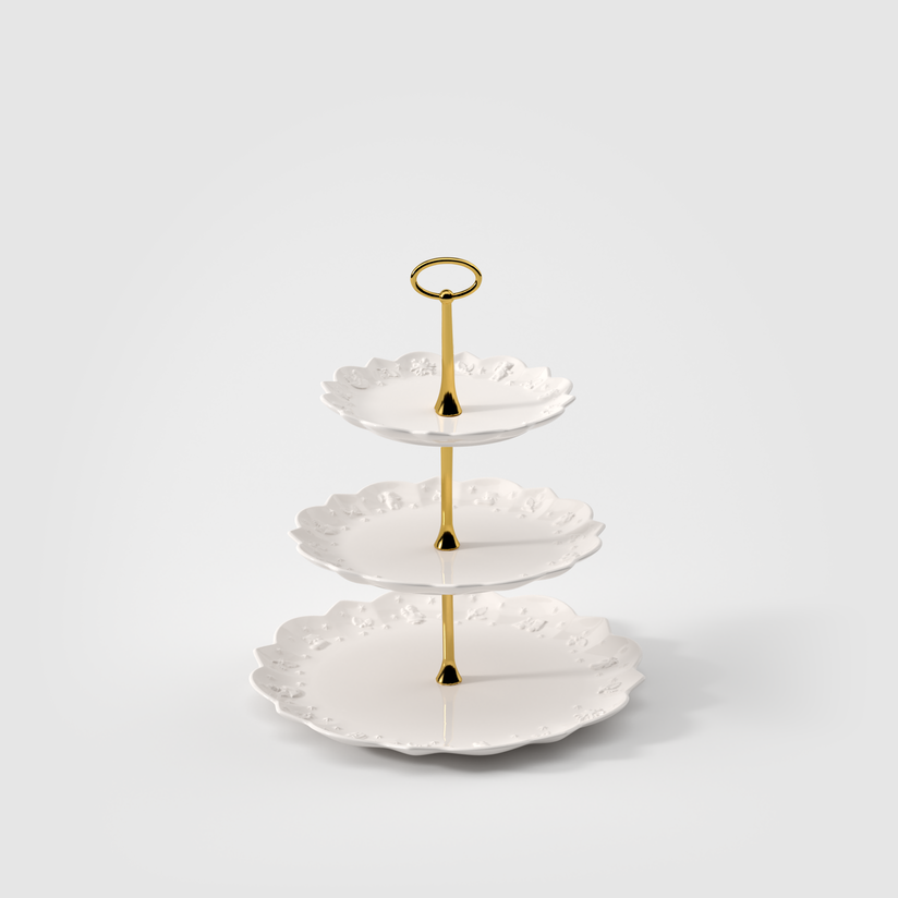 Etażerka wykonana z porcelany premium zachwyca pofalowanym brzegiem oraz wypukłymi, dekoracyjnymi elementami, które przywodzą na myśl przyjemną, świąteczną atmosferę — motywy choinek, gwiazdek i prezentów subtelnie zdobią jego powierzchnię, tworząc efektowną kompozycję. Klasyczna forma i ponadczasowy design sprawiają że doskonale komponuje się zarówno z czarnymi elementami z kolekcji Manufacture Rock jak , Toy's Delight jak i z prostą biała zastawą. Doskonała do serwowania ciast, owoców, pralin lub innych smakołyków.