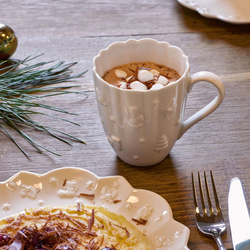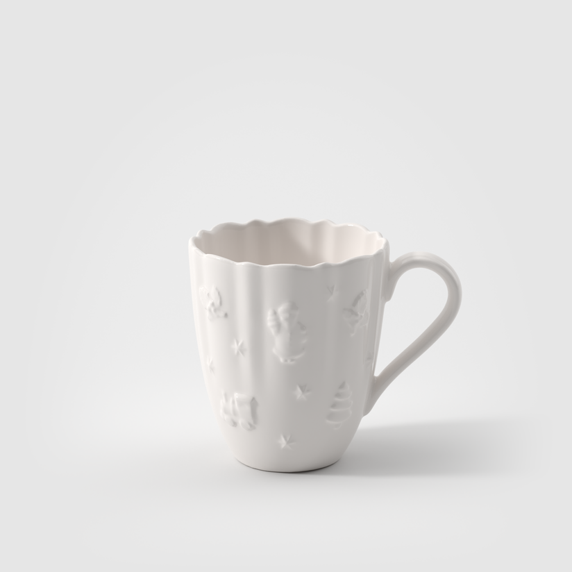 Kubek wykonany z porcelany premium zachwyca pofalowanym brzegiem oraz wypukłymi, dekoracyjnymi elementami, które przywodzą na myśl przyjemną, świąteczną atmosferę — motywy choinek, gwiazdek i prezentów subtelnie zdobią jego powierzchnię, tworząc efektowną kompozycję. Klasyczna forma i ponadczasowy design sprawiają że doskonale komponuje się zarówno z czarnymi elementami z kolekcji Manufacture Rock jak , Toy's Delight jak i z prostą biała zastawą.