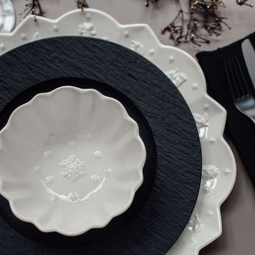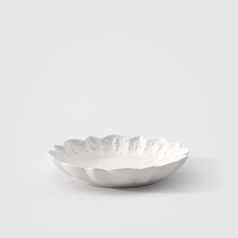 Miska wykonana z porcelany premium zachwyca pofalowanym brzegiem oraz wypukłymi, dekoracyjnymi elementami, które przywodzą na myśl przyjemną, świąteczną atmosferę — motywy choinek, gwiazdek i prezentów subtelnie zdobią jego powierzchnię, tworząc efektowną kompozycję. Klasyczna forma i ponadczasowy design sprawiają że doskonale komponuje się zarówno z czarnymi elementami z kolekcji Manufacture Rock jak , Toy's Delight jak i z prostą biała zastawą.Idealny do serwowania dań głównych podczas uroczystych spotkań ,dodaje stołowi elegancji i odświętnego charakteru.