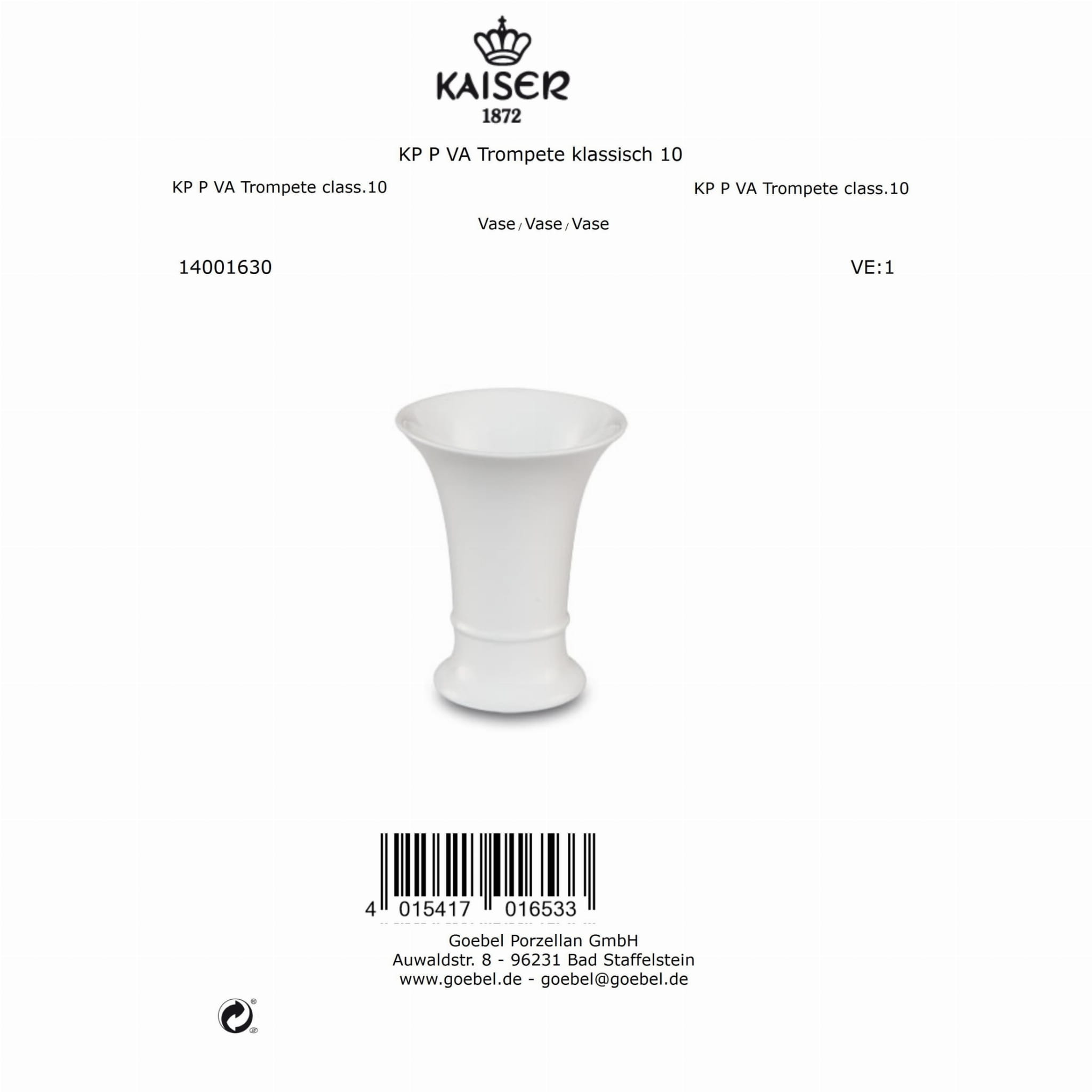 Wazon 10 cm Trompete od Kaiser to elegancka, porcelanowa dekoracja o klasycznej i harmonijnej formie. Wykonany z wysokiej jakości szkliwionej porcelany, zachwyca gładką, połyskującą powierzchnią oraz starannym wykończeniem.