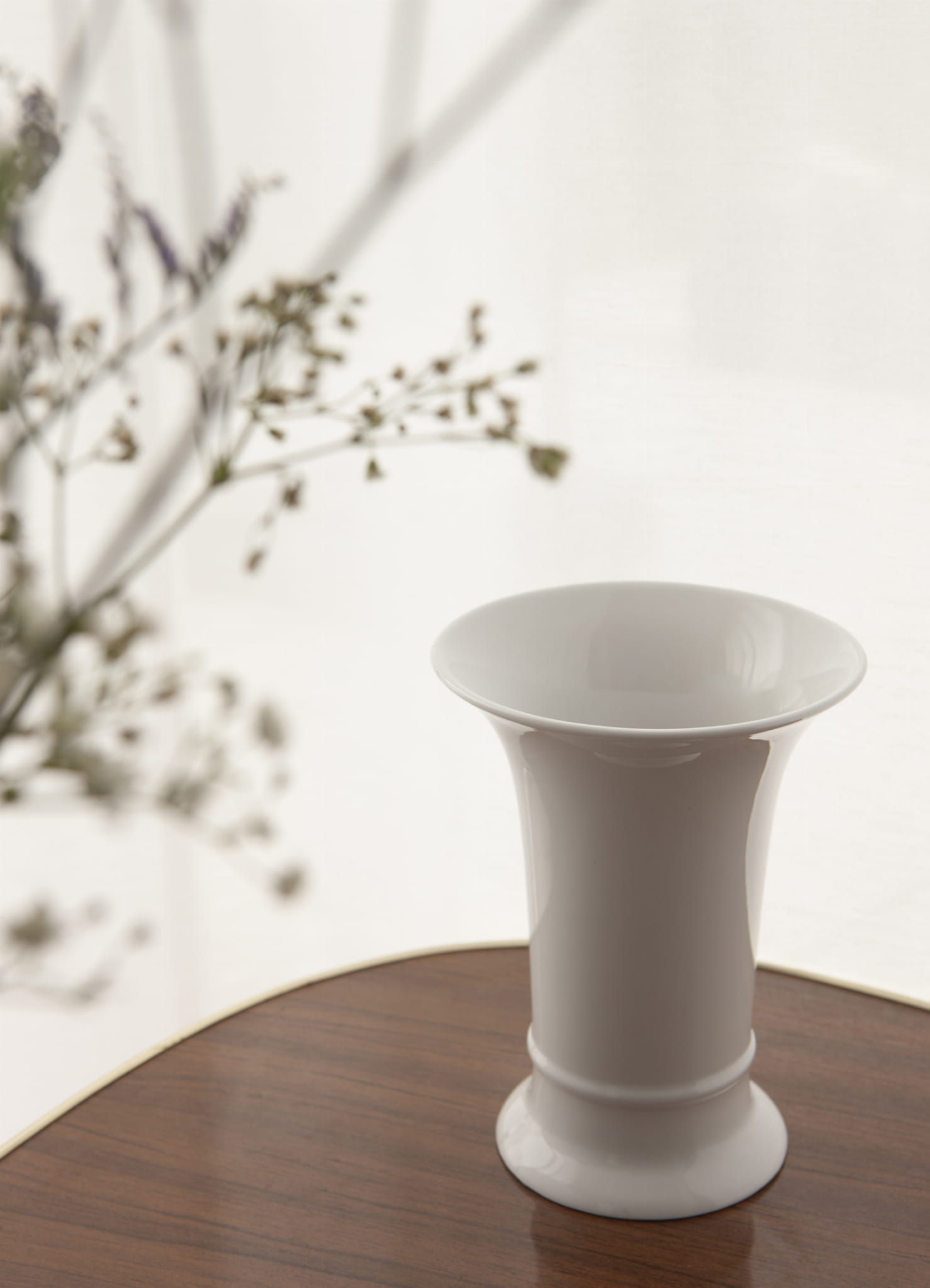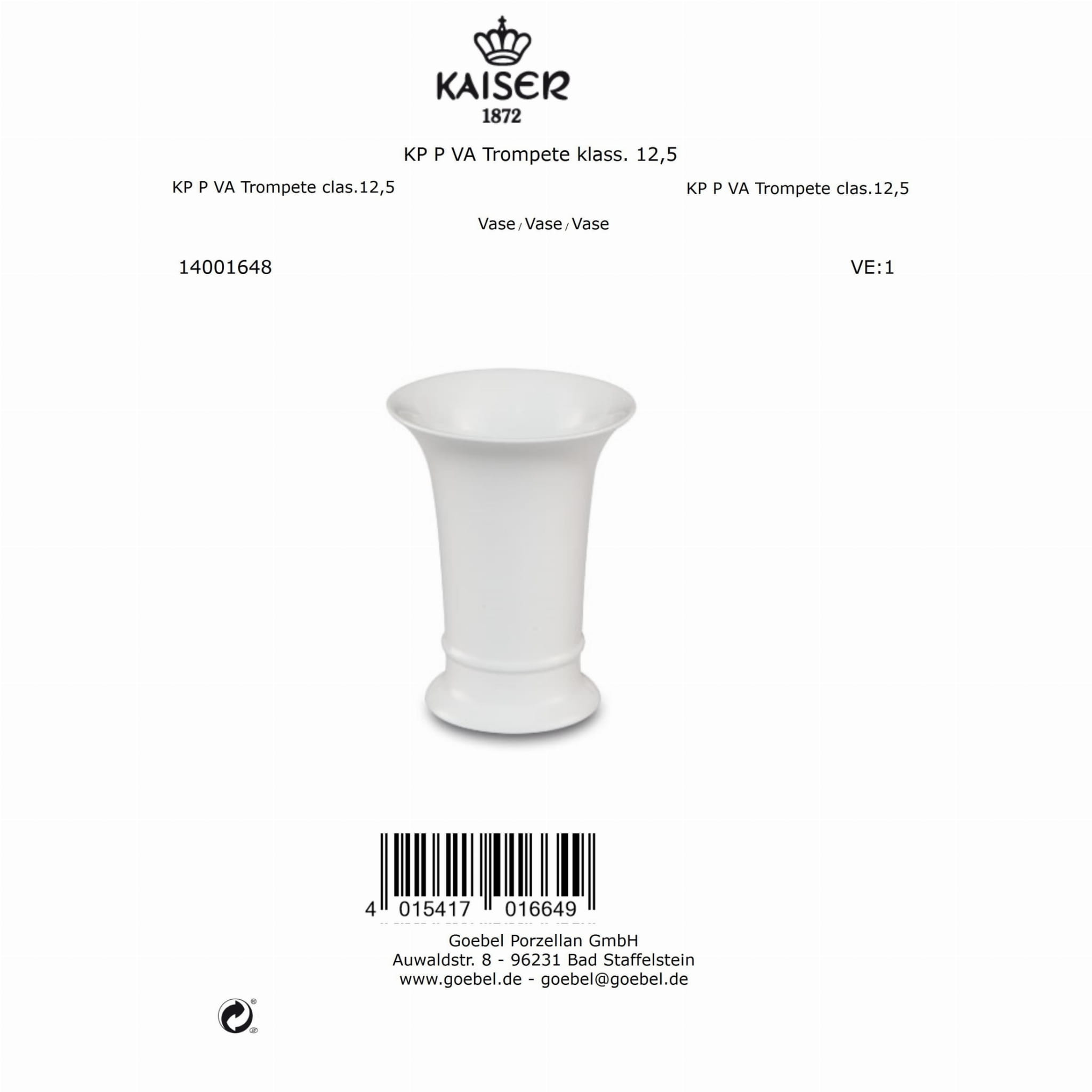 Wazon 12,5 cm Trompete od Kaiser to elegancka, porcelanowa dekoracja o klasycznej i harmonijnej formie. Wykonany z wysokiej jakości szkliwionej porcelany, zachwyca gładką, połyskującą powierzchnią oraz starannym wykończeniem.
