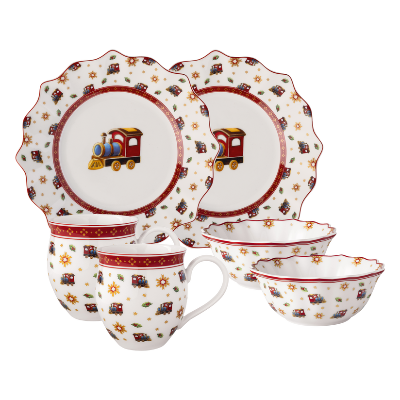Zestaw śniadaniowy dla dwojga Toy’s Delight od Villeroy & Boch to wyjątkowa propozycja z okazji jubileuszu tej kultowej kolekcji. Porcelanowy komplet dla 2 osób ozdobiono uroczym, świątecznym motywem Lokomotywy, nawiązującym do klasycznych bożonarodzeniowych dekoracji. Wzory z serii Toy’s Delight to hołd dla tradycji – znajdziesz w nich także postać Konika na biegunach, Świętego Mikołaja oraz Dziadka do Orzechów.